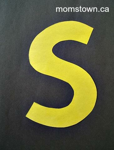 1. Cut a letter “s” out of yellow construction paper, and glue onto a sheet of black construction paper:
