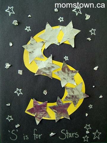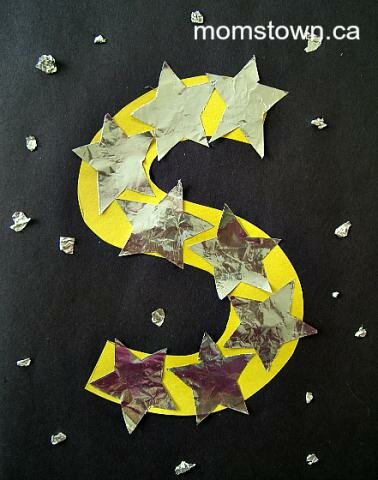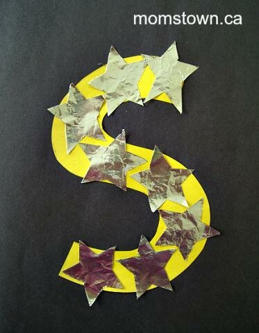 2. Cut several star shapes out of aluminum foil. Glue stars onto the letter “s” (tip, if your kids have trouble working with the tin foil stars, you can glue the foil onto a blank sheet of construction paper first, and then cut stars out of the foil topped paper):