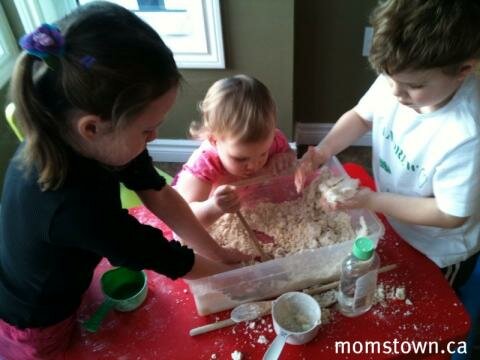 momstown kids from toddler to school age got into the fun sensory activity of making and playing with cloud dough!